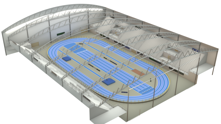Större byggdnad av idrottshall, modellen visas här i genomskärning.